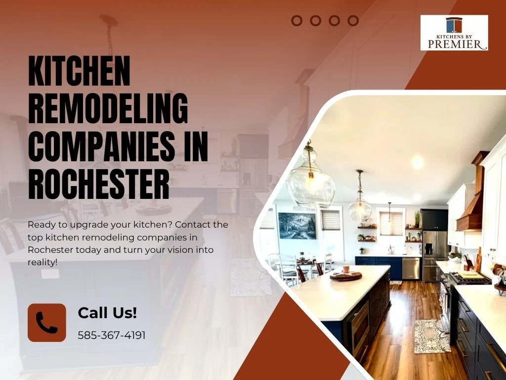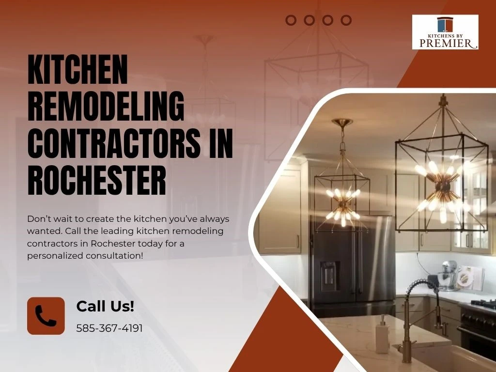 Kitchen remodeling contractor ad in Rochester by Kitchens By Premier featuring modern lighting and cabinetry
